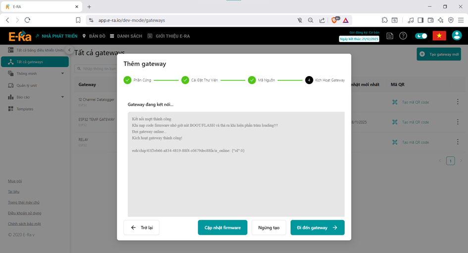 (11) Khi flash thành công, quay lại trang Era. Nhấn "Bước kế tiếp" rồi chờ cho gateway kết nối rồi chọn "Đi đến Gateway"