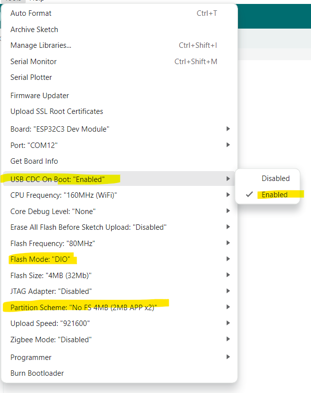 Chọn Tools -> USB CDC On Boot -> Enabled (để in log ra bằng usb cdc tức là com port ở máy tính).
