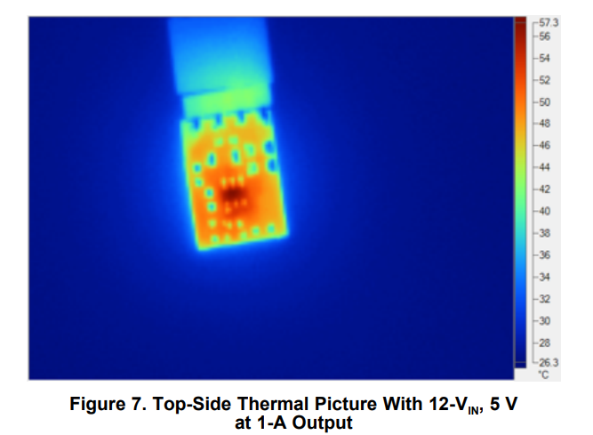 The thermal pictures in below was taken at a room temperature of 26°C, with a 48-V input, 12V at 1-A output without airflow.